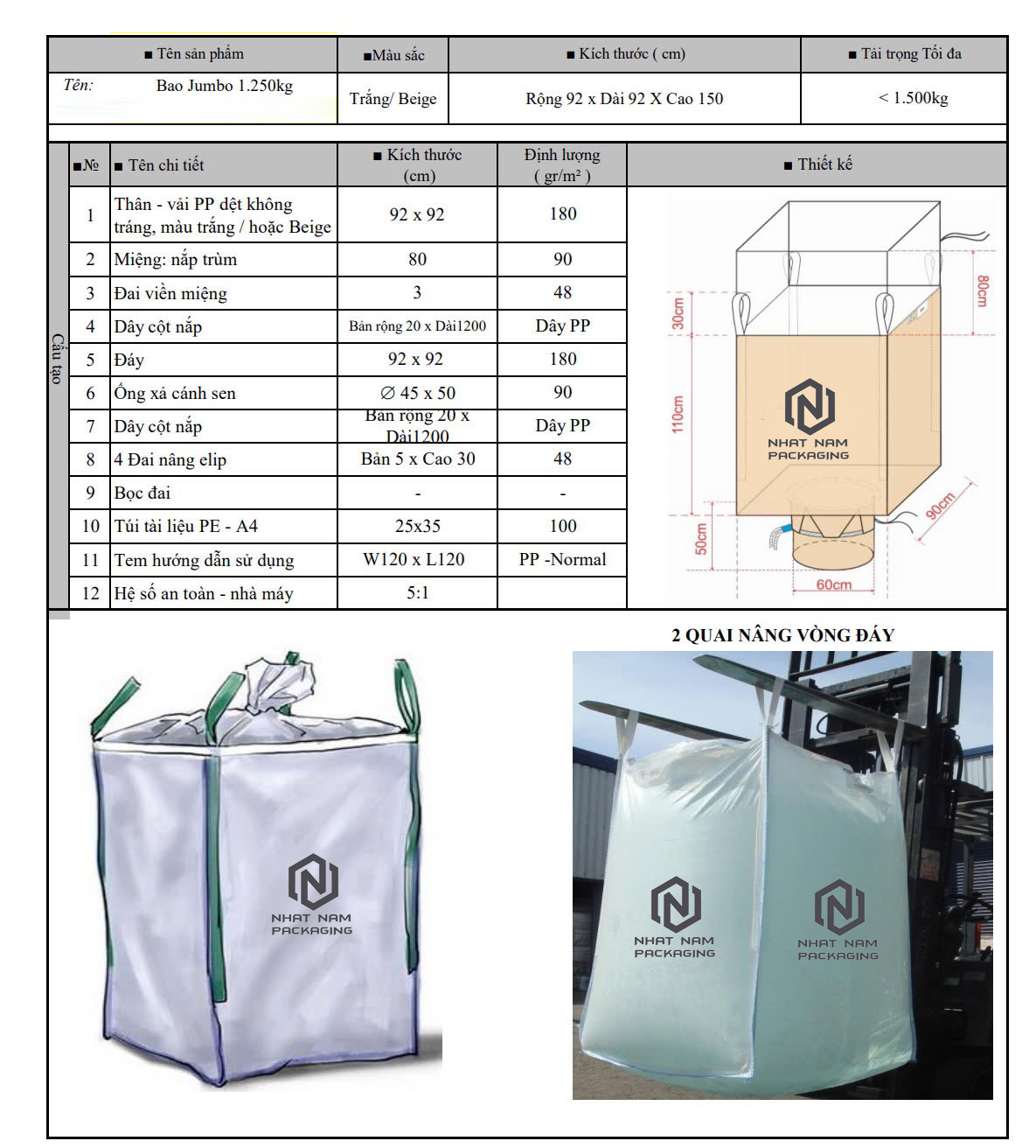 Tải trọng của bao thường nằm trong khoảng từ 500 kg – 2.000 kg và có thể cao hơn. Việc vận chuyển và bốc dở được thực hiện bằng pallet hoặc nâng bằng quai nâng của bao.